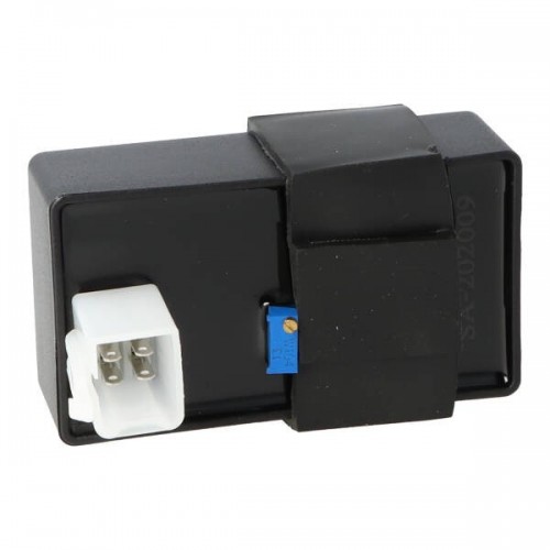 Racing CDI met stelschroef. Door de stelschroef met de klok mee te draaien wordt het ontstekingstijdstip vervroegd.