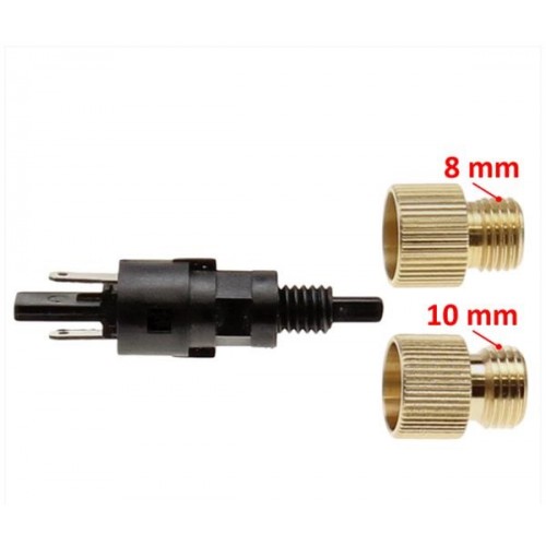 Deze remlicht schakelaar heeft 2 adaptors 1x 8mm 1x10mm. Omdat bij producties van handles soms onduidelijk is welke gebruikt is kunt U nu de juiste monteren de andere houdt U dan over .